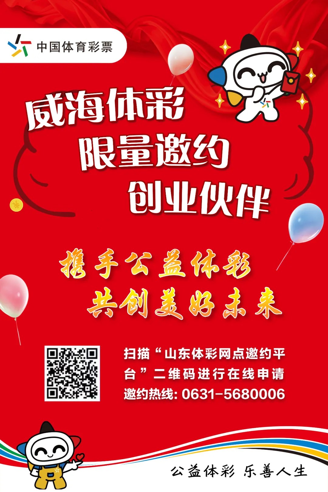 為實現中國體育彩票建設負責任、可信賴、高質量發(fā)展的國家公益彩票發(fā)展目標,威海體彩現面向全市限量邀約優(yōu)秀創(chuàng)業(yè)伙伴,共享億元彩票市場,歡迎來電咨詢或咨詢縣市區(qū)聯系人。