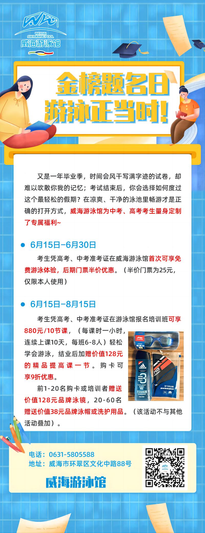 6月15日-6月30日考生憑高考、中考準(zhǔn)考證在威海游泳館首次可享免費(fèi)游泳體驗(yàn),后期門票半價(jià)優(yōu)惠。(半價(jià)門票為25元僅限本人使用)